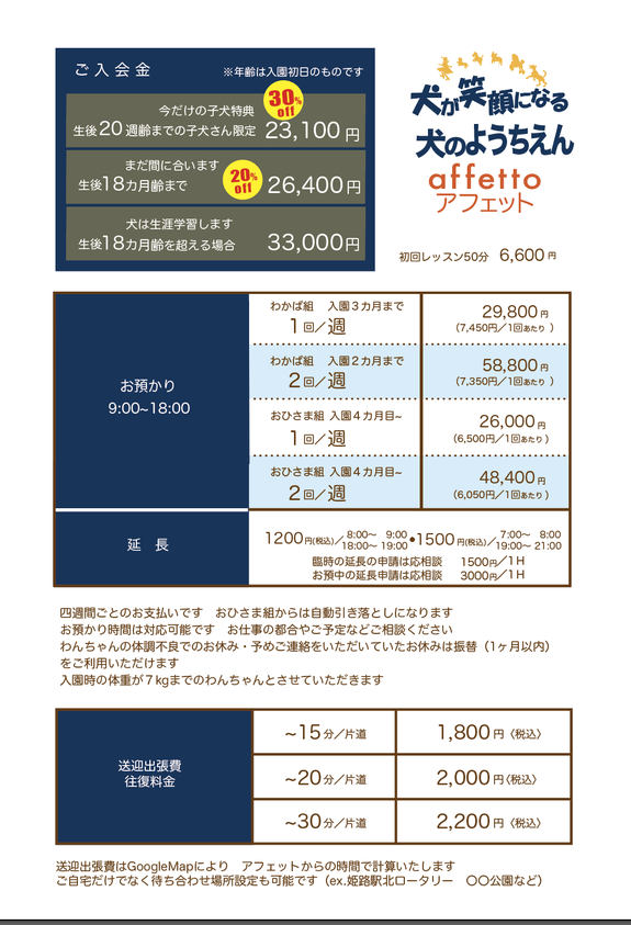 初回 回数券チケット7枚綴り(5ヶ月未満の子犬は8枚綴り)は3ヶ月間有効です